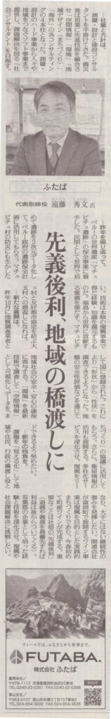株式会社ふたばお知らせメディア情報【福島民友】ふくしま新春インタビュー 2026.1.20 メディア情報 【福島民友】ふくしま新春インタビュー 1月17日の福島民友朝刊の「ふくしま新春インタビュー」にて 弊社代表遠藤のインタビューが掲載されました。 本県の未来をリードする各界のトップをインタビューするこちらでは、 「先義後利、地域の橋渡し」と題しまして、 昨年着手したマチュピチュ遺跡の調査の振り返りと新年の抱負を語っております。 是非、紙面もご覧いただければと思います。 次へ お知らせ一覧へ 前へ