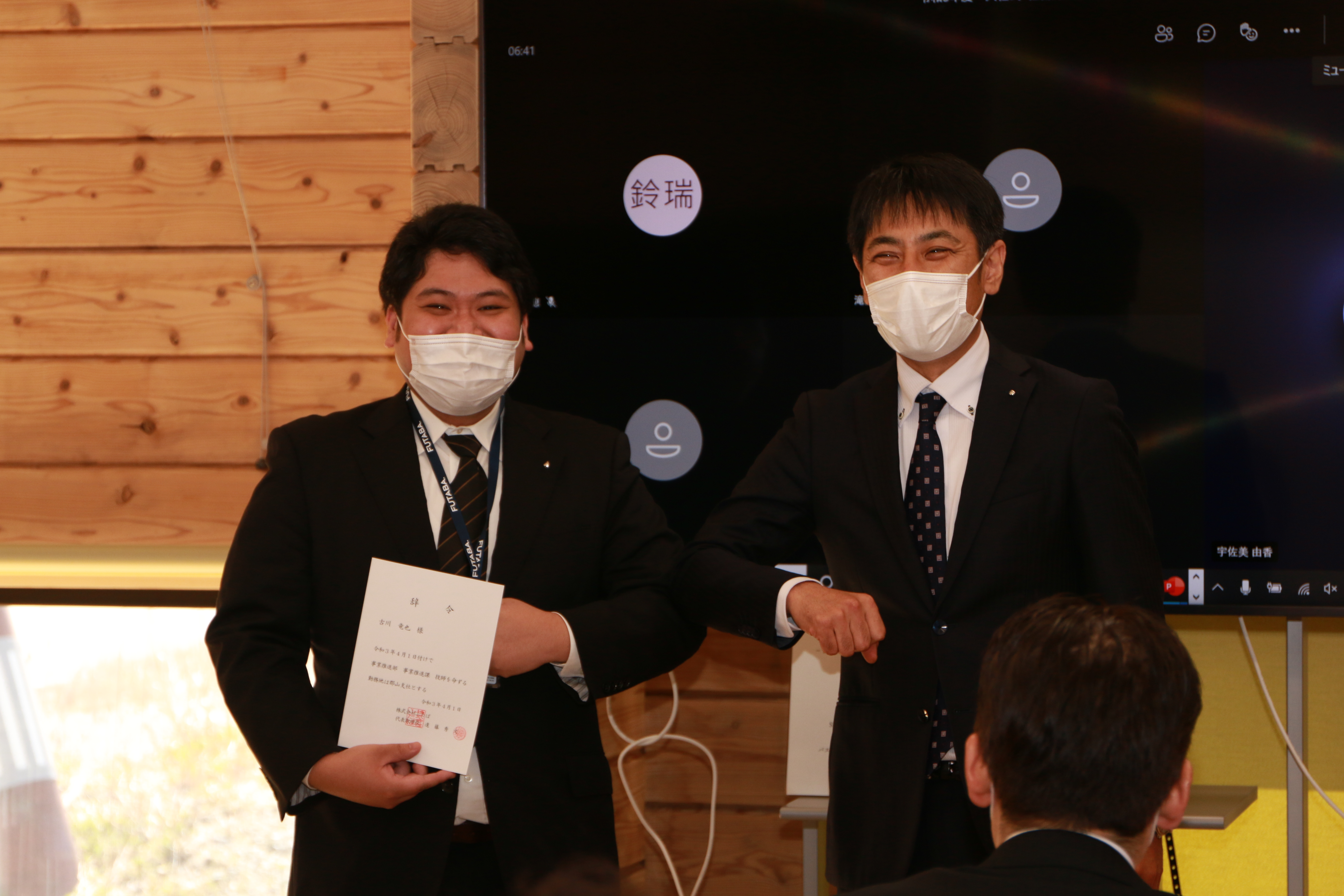 入社式は開所したばかりの【整の箱】~ふたば交流センター~で行いました。震災後、南相馬市の仮設住宅地の集会所として使われていた移設を移築したものです。