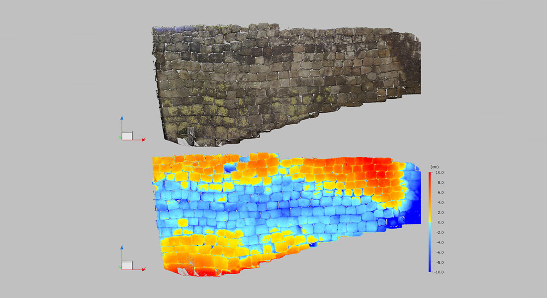 歴史的建造物や石垣等の文化財には地上レーザを用いた記録・計測を行います。点群データより断面図等の各種図面や動画の作成が可能で、さらには復元にも活用することができます。